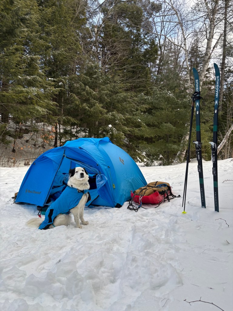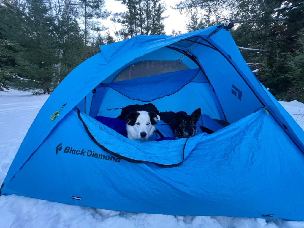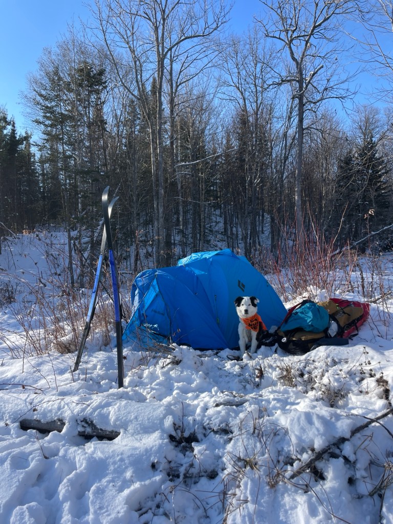 We fell into a nice rhythm— start off with a handful of miles all together, then dogs go back in the car for a long nap while Pokey (the pulk sled) and I go out for a longer ski. Once I’m tired out, either head home, or strike out all together for a short ski to a spot safe for camping. Make camp, cook dinner before dark, and into a cuddle pile in a nest of blankets. The dogs were doing less miles than in past years, but they were happy, and I was getting a lot more mileage!
