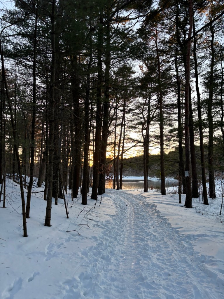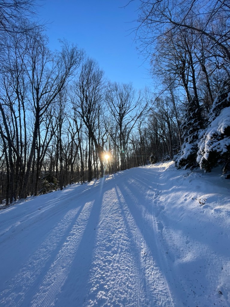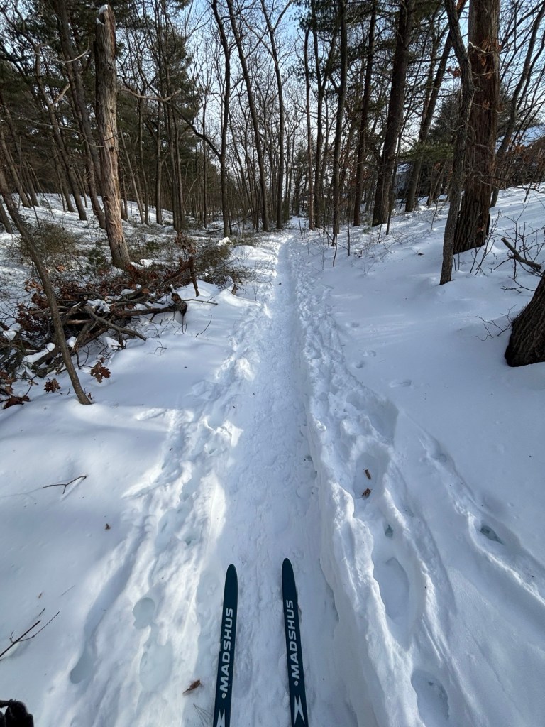 The snow just kept snowing! By the time it let up Monday mid morning, we had 17”, then it turned back on that evening and added a half-dozen more to our totals. I’d never even hoped to dream that I’d get more than a couple of short, cruddy skis in at home. Boston’s winters have gotten so lame in recent years that you cannot count on anything. But after a couple of days of the town getting dug out and trails getting broken in, we were set up for everyday skiing right from home! There wasn’t even a thaw on the horizon in the forecast.