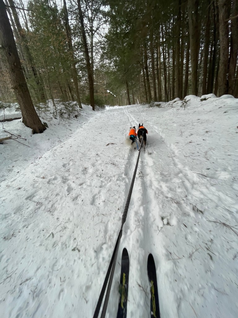 This was ideal for the last phase of training, when you’re fit and just need to stay that way without injury; the “don’t fuck it up” phase. I mixed in morning skijors straight from our front door, with longer sled skis looping all our favorite trails in the fells. The deep drifts were extra tough on the dogs, so until things got well set their adventures stayed very short, freeing me up so sail off solo on my death sticks.