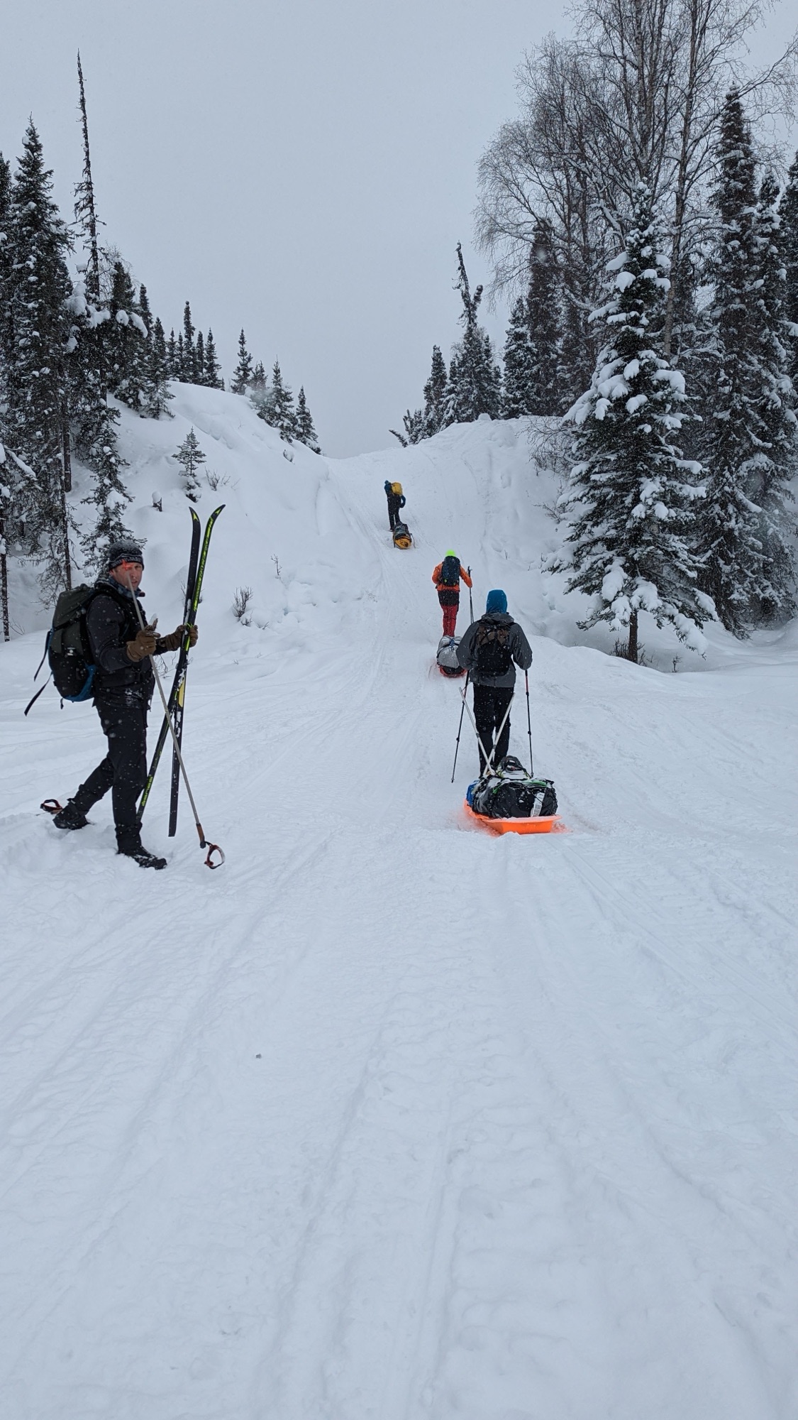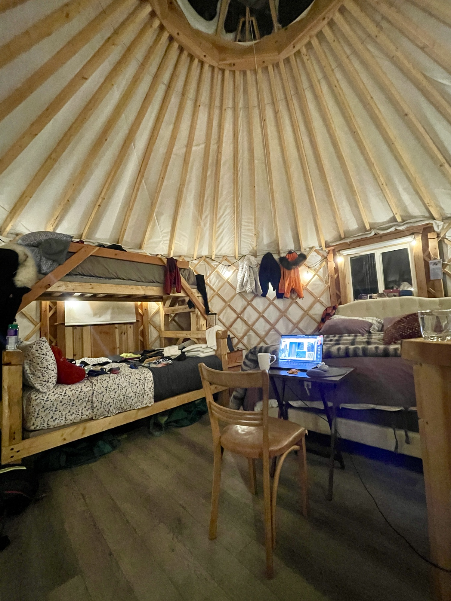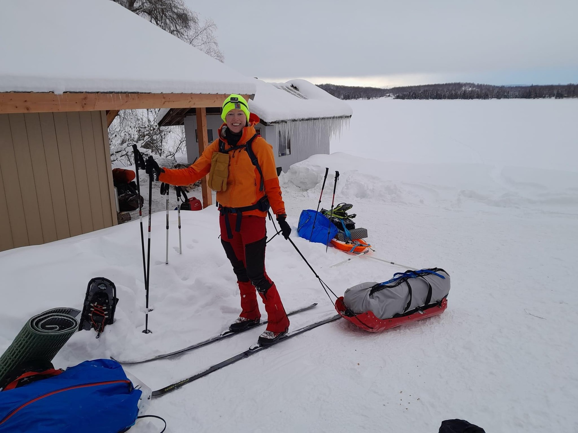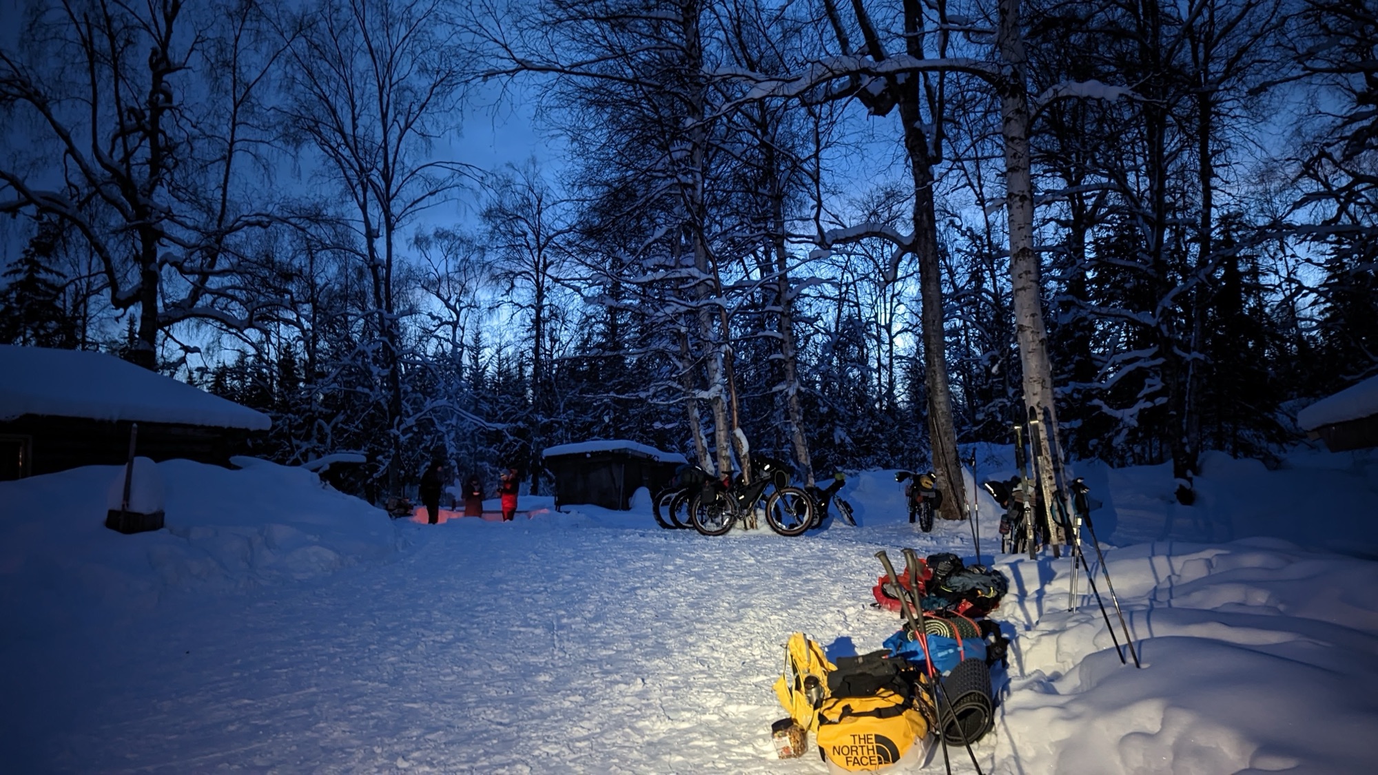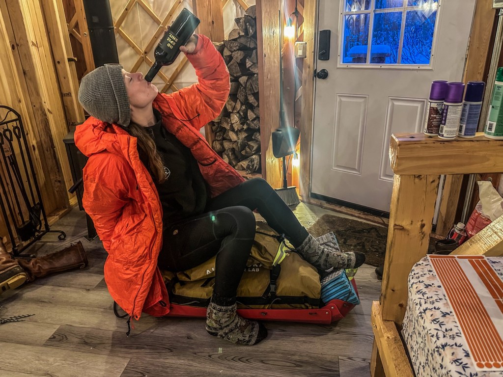 “Work from Yurt” was a great experience—I simply worked 4:30am-1:30pm (east cost time normal hours) and had afternoons, evenings, and weekends free for training, logistics, getting my skis serviced, and cooking on my little hot plate. 3 weeks is fine to live without a shower, hot water, stove, or freezer, if all you’re there to do is ski and prepare to ski. Once I was on the mend from the cold, I got to do an overnight on the trail and camp out near mile 30 of the race-course. I kind of accidentally crashed 2024 ITI camp, which was fun to see Race Director Kyle, Trail Boss Adrian, and our instructors from the previous year, Josh Brown and Troy Szczurkowski (both raced in this year’s ITI).