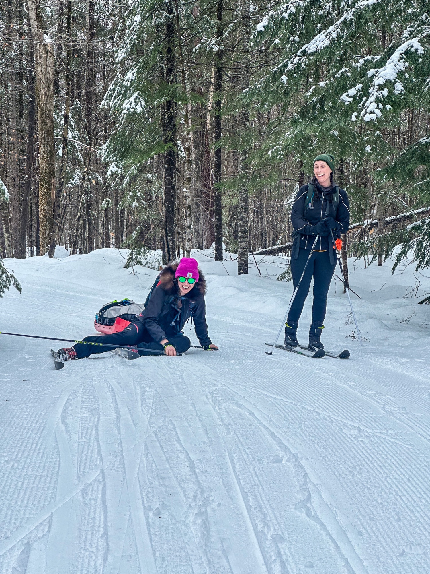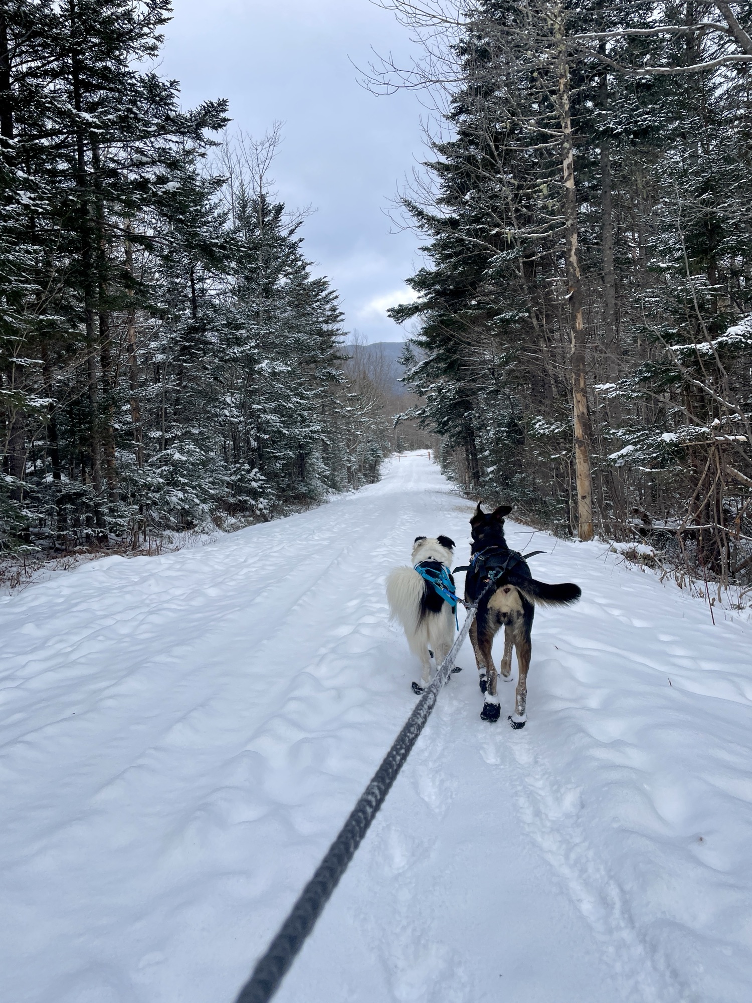Quick, how many inches of snow do you think Boston got this winter (2023-24)? The answer is 11 inches…total. *sadface*. Yep, New England is warming and wetting faster than almost anywhere in recent years. How’s a racer to train to ski 300 miles when she lives in perpetual spring? In the immortal words of the Avett brothers: ‘Tell the ones who need to know/ We are headed north’. Wy&Wo and I moved to a refurbished barn in New Hampshire’s White Mountains. The Barn was ski-on-ski-off to Bear Notch Ski Touring, a 100% dog-friendly Nordic ski center, and very close to the snowmobile network that goes up over the bear notch mountain pass in Bartlett, New Hampshire. I figured a little hill training wouldn’t hurt if I had to ski over the Alaska Range. The month we spent up in the Whites set us up for success—I worked remotely for much of the month and was able to ski my face off before, after, even sometimes during the workday. Weekends were barnburners of multiple long skis. I got to practice in varied weather conditions, get hours in the dark in in the mornings and evenings, and practice using my whole setup including my pulk sled, who I affectionately named Pokey (yes, it’s a Gumby reference).