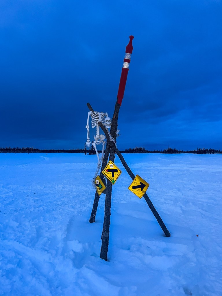 I woke up and checked my sled thermometer: -25f. Cool cool, cool. I woudn’t say I exactly took my time getting up and moving, but I didnt set any records. Right as I was getting close to packed up, My camp friend Vinny walked up. He’d stayed at CP-1 overnight and not really had great rest there. My assessment was he could use a travel buddy for the morning, so he went ahead slowly so I could catch up. We traveled through the cold swamp together and onto the trail down toward the Susinta and Yentna rivers. Race day two would see us getting onto the Yentna and seeing how far we could travel north. The Alpenglow on Denali as we moved through the swamp toward the river was stunning. The Skeleton marker was at our intersection to head down toward the river–a bit of a tradition, and alternatingly hilarious or dark, depending on your mood I suppose.