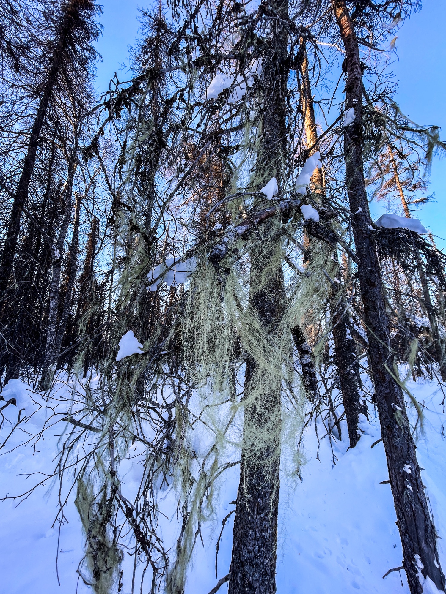 After an hour stop-off at the Shell Lake Cabins to have a hot lunch (Mountain House Pad Thai!), change headlamp batteries, and rest a bit, I continued on toward CP-3 Finger Lake. After a brief climb through some trees, the trail moved into new terrain I thought of as “stairmaster ridge”. It was a long linear expanse, with trees on either side, of continuously sloping upward terrain. Not quite a hill, but nowhere near flat. I could feel myself literally climbing up into the foothills of the Alaska Range. It was quite exposed and breezy, so I ended up adding my hardshell coat over my main coat, to make use of the hardshell’s zipper. This would become my new system for basically the duration of the race.