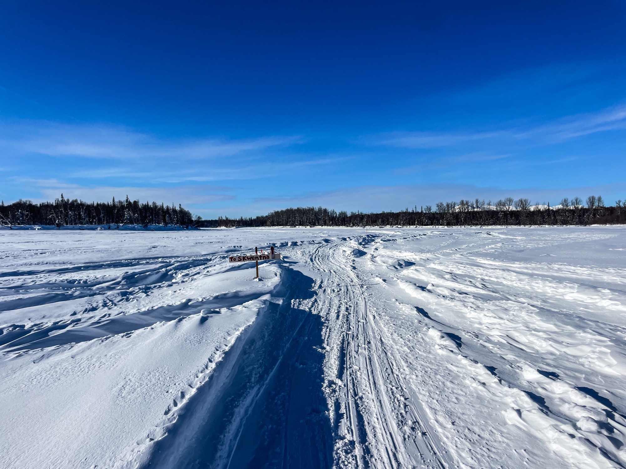 Speaking of really cold weather–it was +7F when I left Skwentna Roadhouse, and the trail was actually in great shape. “Huh, maybe I can actually make up some time today!”, thought a naïve racer, as she flow down an access road toward a town maintenance shed. I turned a corner and broke out into a huge swamp. Unobstructed views for miles (or, there would be, once the sun rose and I could see where I was). For now, all I saw was my skis skid to a hault in a mashed up paste of wind-blown snow. Glide was not to be had Thankfully, my skis stayed on top of the piled drifts which made walking across it MUCH easier. I felt sorry for the walkers and bikers I knew were behind me. Later, I saw race director Kyle as he passed me (we were on similar schedules, he’d stayed in Bentalit the night before) and he said they were really strugging in the drifts. It turns out that the cyclists couldn’t really get through it at all–all five who had stayed at Skwentna with me the night before ended up going back and scratching from the race.