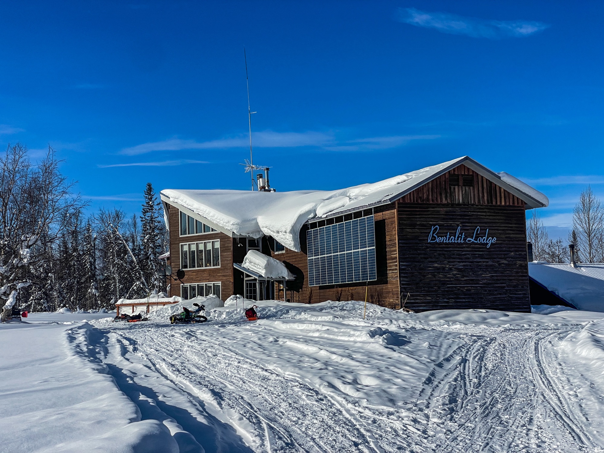 After an hour I got back on the trail to head to Skwentna. Bentalit was perched up on a hill above the river so there was a little excitement skiing down to the trail. Nothing makes you feel more like a serious participant in a winter ultramarathon than falling in and out of every checkpoint…but they do always tend to involve hills and berms and other hazards. A nice afternoon of easy (alebiet not as fast as I’d like) skiing up to the next waypoint–Skwentna Road House. This is another spot that’s a dogl race checkpoint but not an official ITI checkpoint, with food and bunks for sale.