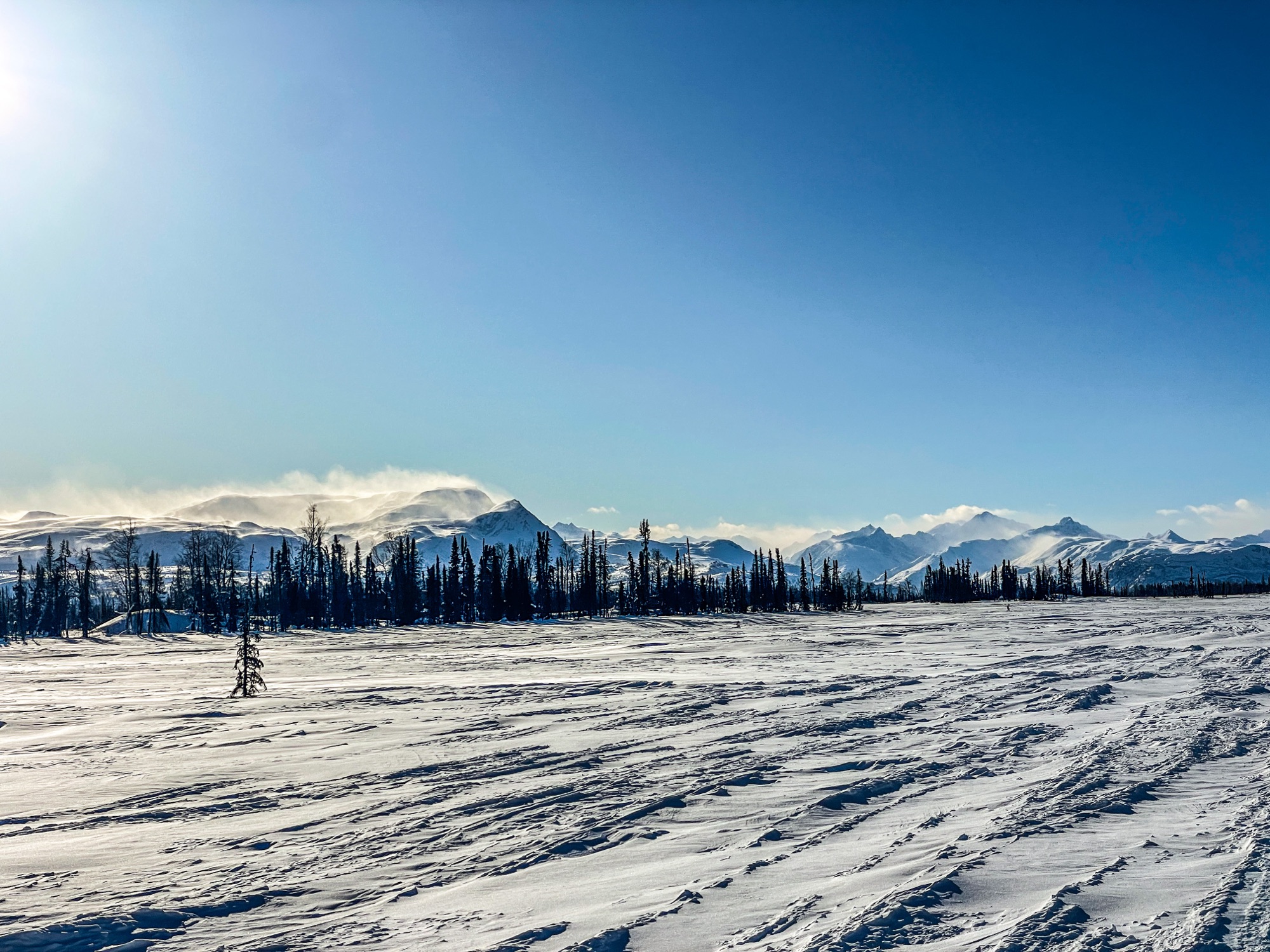 Some pics from morning on the way north toward CP-2, Bentalit Lodge. The weather was absolutely perfect, but the trail was still a little slow. Faster than the day before, but it hadn’t been groomed by the snowmachine groomers so could still be fairly choppy and with I was getting very little glide on my skis. I started to call my ski stroke “the McGrath Shuffle”, shuffling forward at a couple of miles an hour, but if I kept it steady would eventually get me there! I was much better about nutrition and hydration now, realizing how critical it was to keep a steady stream of calories and water to keep my energy level consistent. I set my watch to have an alarm go off once per hour, when I had food and drink whether I felt like it or not. Cannot reccomend this strategy highly enough.