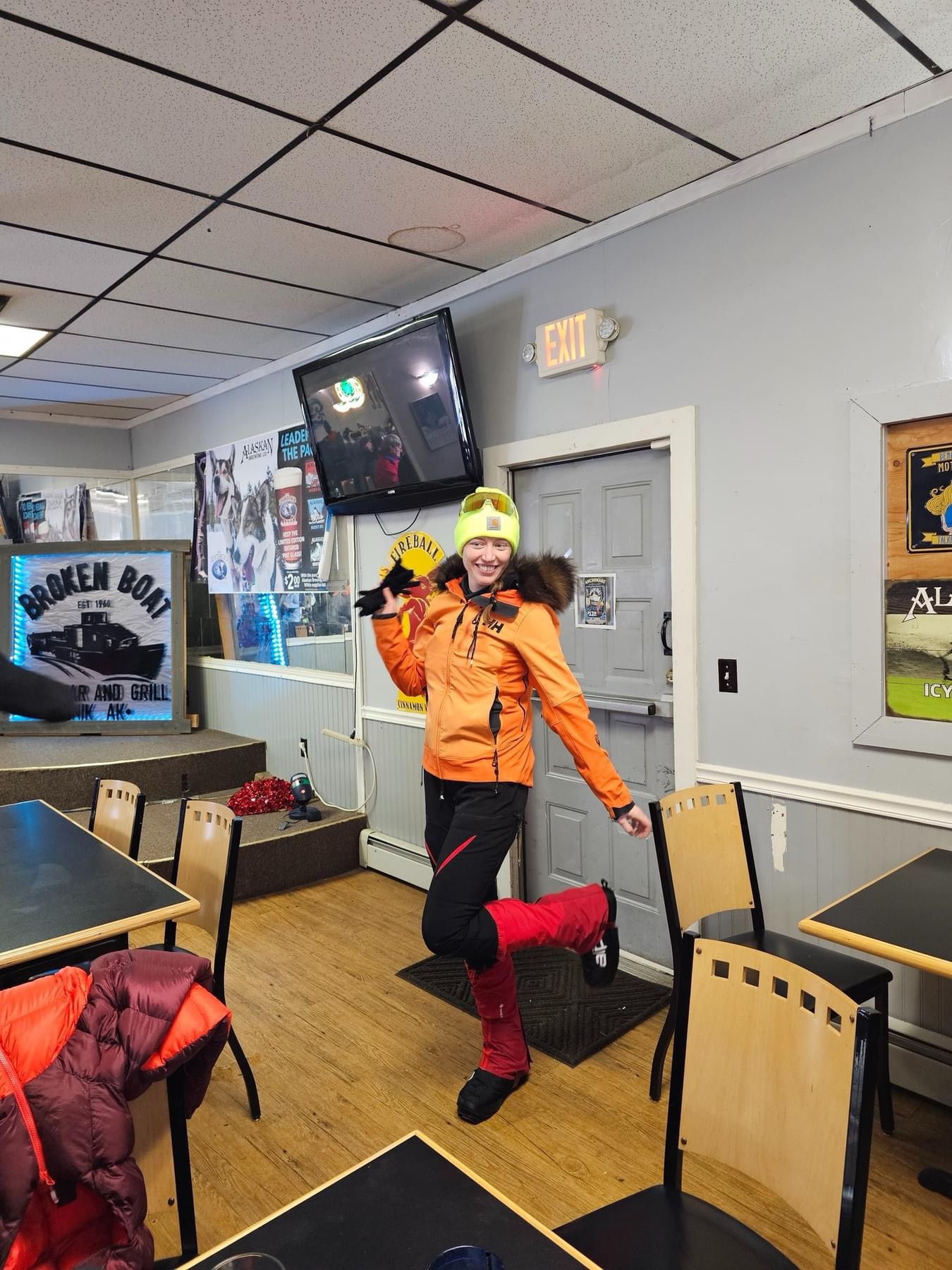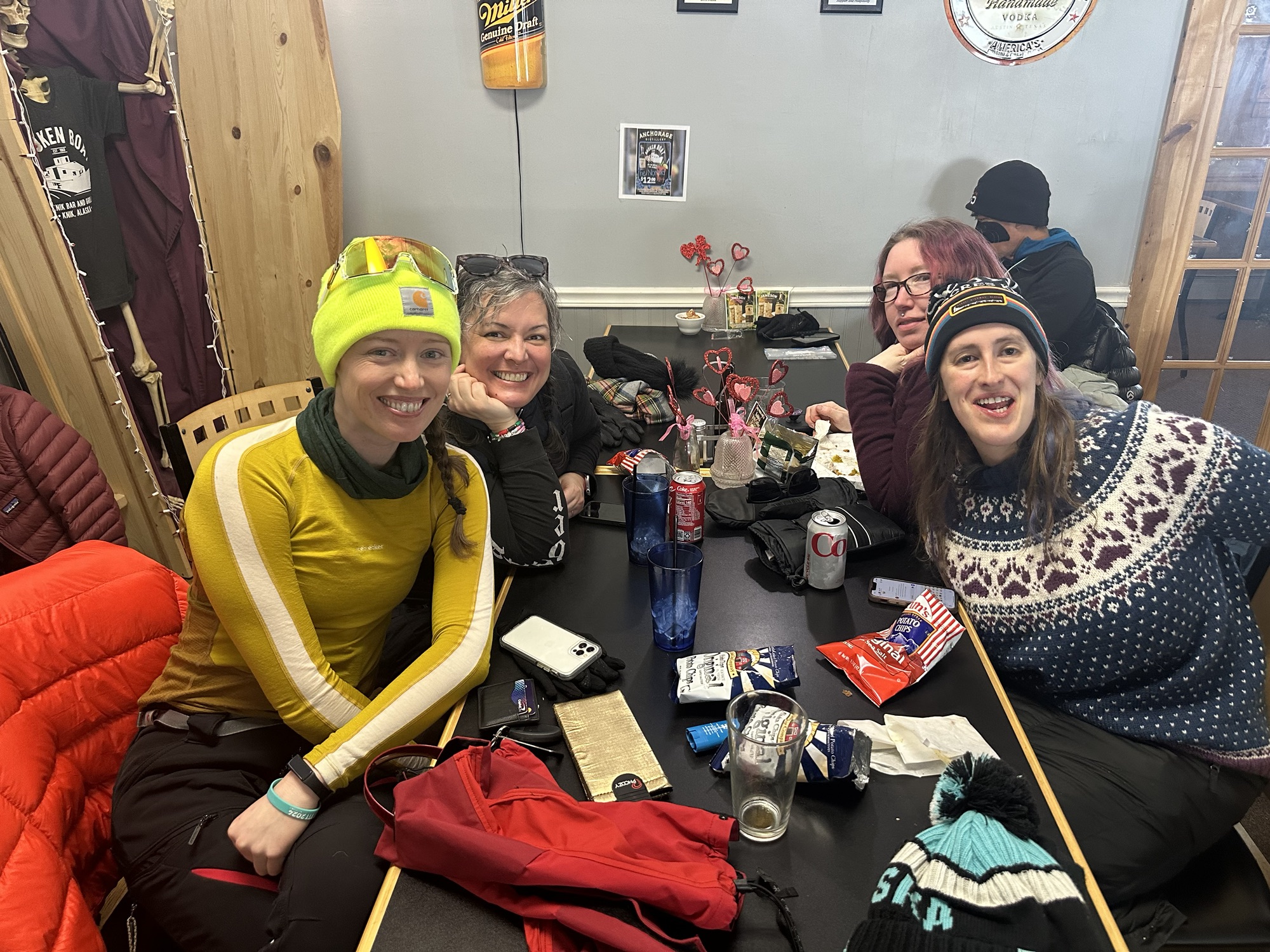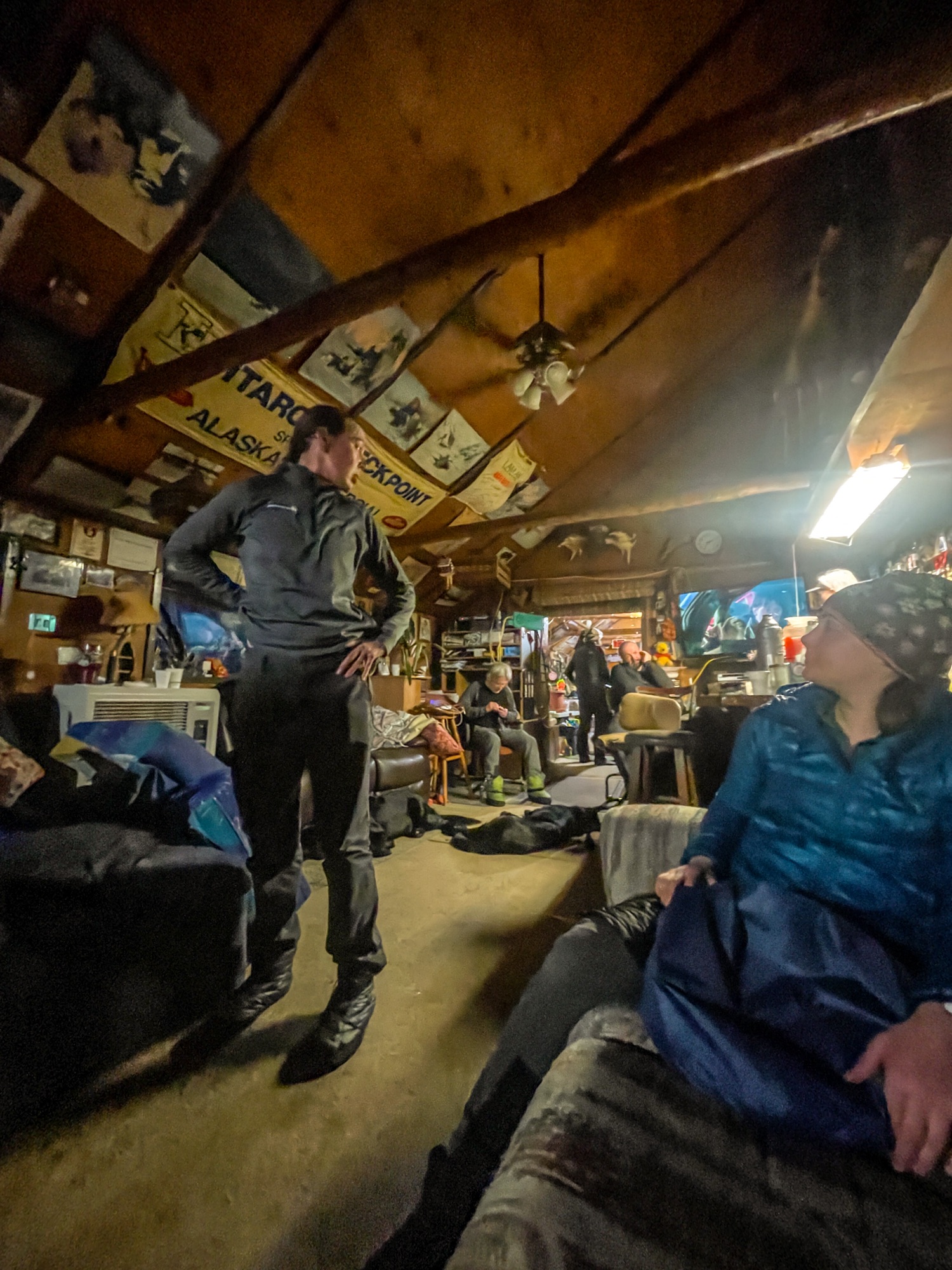 Yentna Station is not an official checkpoint for ITI, but it IS an official checkpoint for Iditarod. It’s well siutated directly on the river for convenient access from the course, and offers hot meals and shared bunkrooms for a nap or an overnight. Everyone who was working the roadhouse was a delight–exicted about our race, friendly, and immensely accommodating. I snagged a grilled cheese and tomato soup and a coveted bunk. Not everyone was so lucky…Vinny got a cot and I think Jason had to sleep on a pad on the living room floor. A lot of racers had been slowed down by the conditions and decided to stay over at Yentna. It’s very difficult to bivy out on the river overnight–there’s no cover unless you climb up the steep banks, and the river can get very cold overnight.