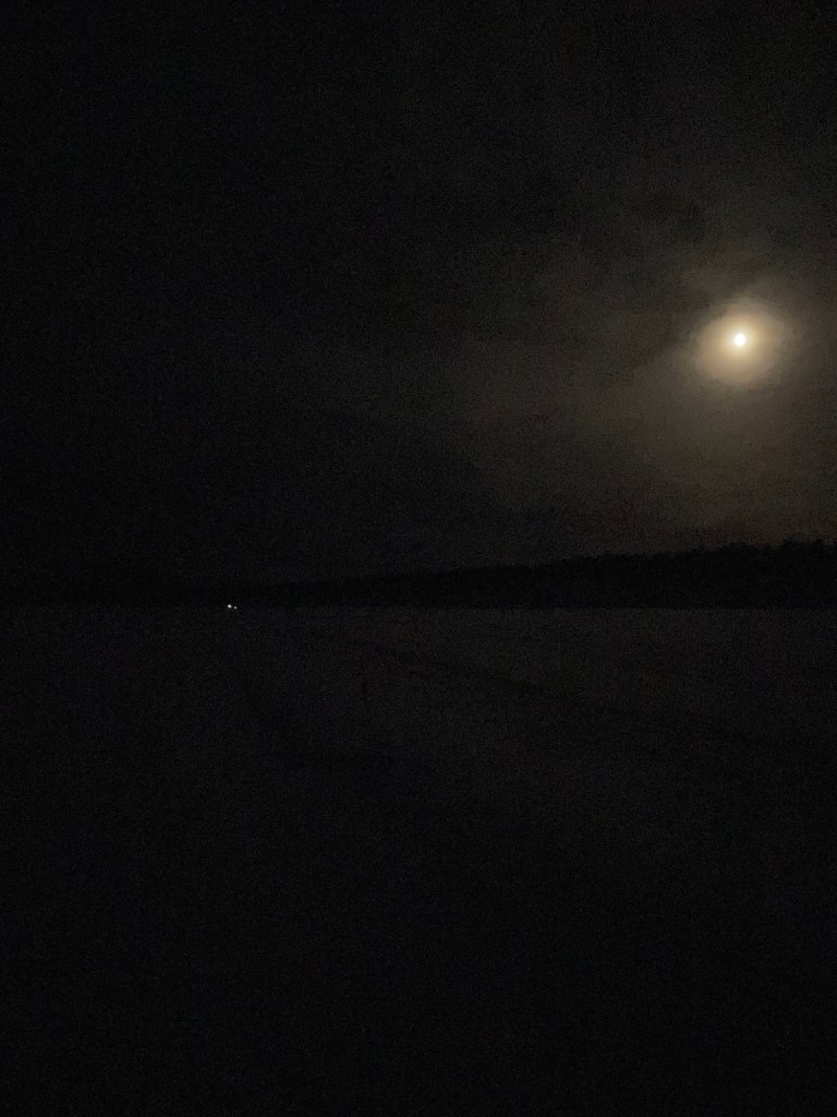 My friends surprised me by meeting me at the Brewery with a quick celebratory toast, then driving past to cheer on the ice road across Big Lake. It made me laugh with them hooting and honking, leaning out of the car window. Their excitement was a bit infectious as I new the 5+ mile lake got a little monotonous (come back to me on this re: the Yentna river!!). I finished crossing Big Lake without incident right as the light was lowering. Switching from sunglasses to headlamp and continuing on, I was glad to be familiar with the route. Id forgotten a couple sections close to CP-1 got pretty hilly, and exerted myself a fair bit too much climbing up some hills on ski that would have been better walked up. Rookie mistakes.