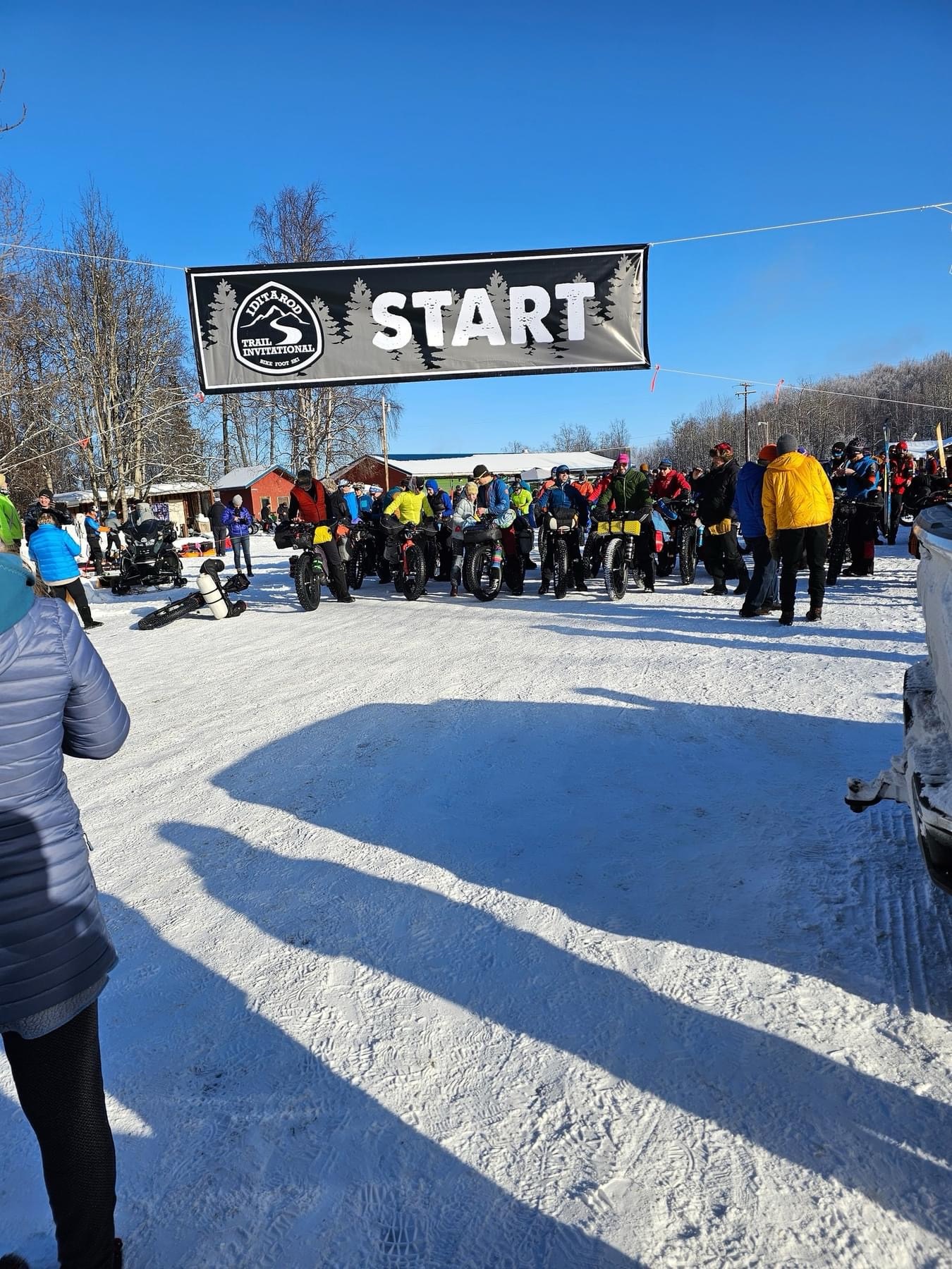 My friends made it over to the bar from the finish line of the Junior Iditarod, happening just a few dozen yards away on the same lake. We caught up and enjoyed some grilled food at the bar before I started to gear up and get myself situated into the starting queue–near the BACK so I wouldn’t get in any real racer’s way. Our core group of non-cyclists from ITI camp (affectionally called the ‘ITI Feet People’) including fellow racers Vinny and Jason, and future racer Fred, got a quick group pic. ITI Race Official Cynthia frantically scurried around getting replacement trackers to the last couple of athletes still not pinging. The vibes were good.