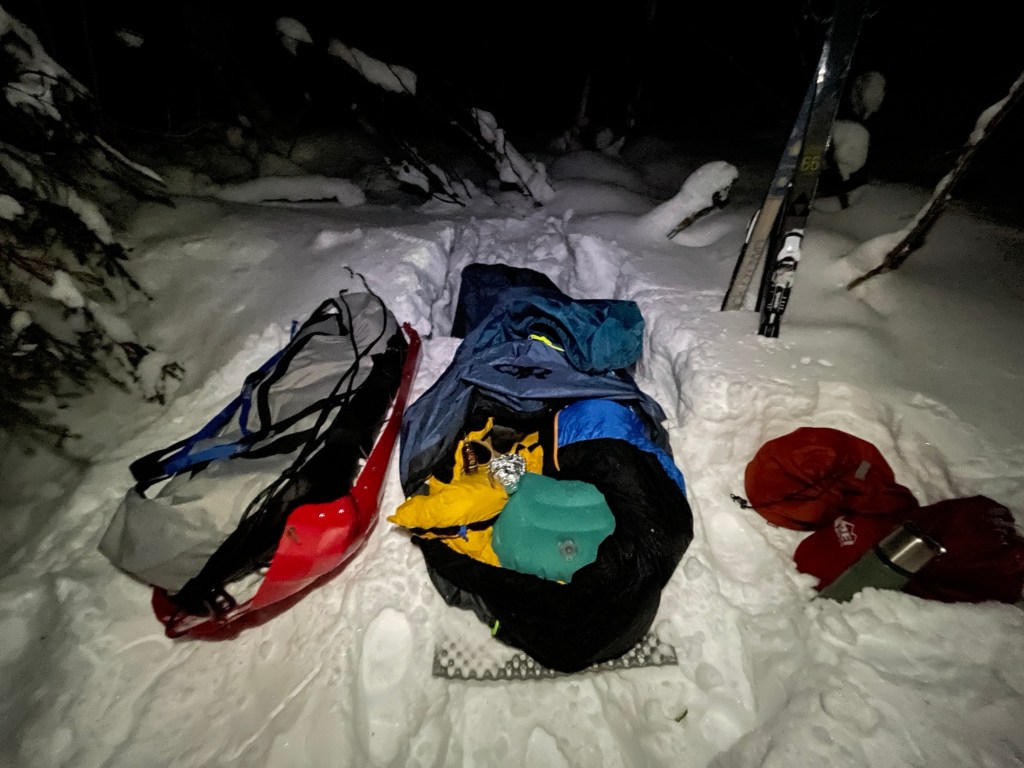 My camp buddy Jason, who’d been at Butterfly the same time as I was, caught up to me and passed me on the hill. We quickly discussed our bivy plans for the night and then parted ways when I found a good spot for me and he wanted a bit more mileage. I felt alert but I know myself–I’m a morning person. Pushing past 12:30 am on the first day was not going to set me up for success. So I stomped the snow out of my bivy site, got out my sleeping bag, pad, and bivy sack, and crashed out.