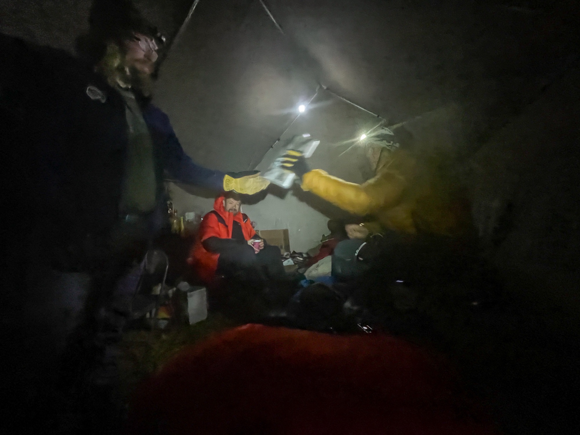 I dry my gear as if I’m going to go on as I consider. I was dealing with some gear malfunctions, which weighed heavily on my choice. I wanted a weather report, and Sunny and I both wanted an assessment of our fingers. The weather report was actually quite good–it was supposed to warm up considerably for the next few days. I didn’t have my airpad anymore, but would be able to get by with just my ccf pad. I start to think this might actually happen. After all…I can have the entire balance of the day to rest… Sunny was going to pull me out of a scratch, yet again! We said goodbye to Doug as he headed out to tackle the next leg of trail, and rested and recharged in the cozy tent.